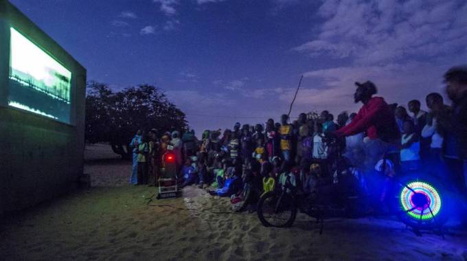 Está a punto de comenzar una proyección de cine en la aldea más remota y aislada de Senegal, donde no hay electricidad ni agua corriente. Son las nueve de la noche. Todo está oscuro. La población se sienta frente a una gran lona blanca colgada entre dos baobabs. En este cine, las butacas son dunas de arena blanca y el techo de la sala es un cielo plagado de estrellas. Hace una noche agradable, corre una ligera brisa y sigue llegando gente. Para que comience la proyección, solo hace falta un voluntario que se ofrezca a pedalear. Aparece un espontáneo y se sube a la bicicleta. El fundido de apertura llega al compás del ciclista y su pedaleo. Empieza la proyección.