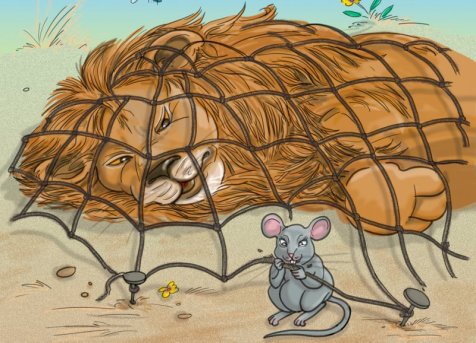 El ratón oyó los rugidos y rápidamente acudió donde estaba el león para cumplir su promesa. Pero el rey de la selva seguía desconfiando de un pequeño ratón. Sin embargo, el ratón, sin más dilación, se subió hasta donde estaba el león y empezó a mordisquear la red. Y la mordisqueó y mordisqueó hasta que la red se rompió y liberó al león.