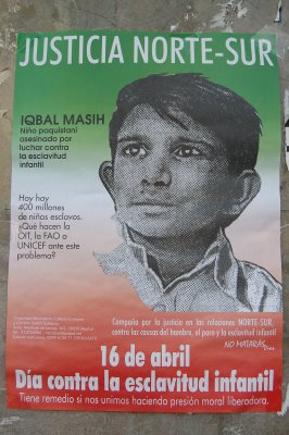 Al niño pakistaní Iqbal Masih, nacido posiblemente en 1982, le arrebataron la infancia cuando empezó a trabajar con tan sólo 4 años y le privaron de la juventud y la madurez cuando le asesinaron con tan sólo 12 años, el 16 de abril de 1995.